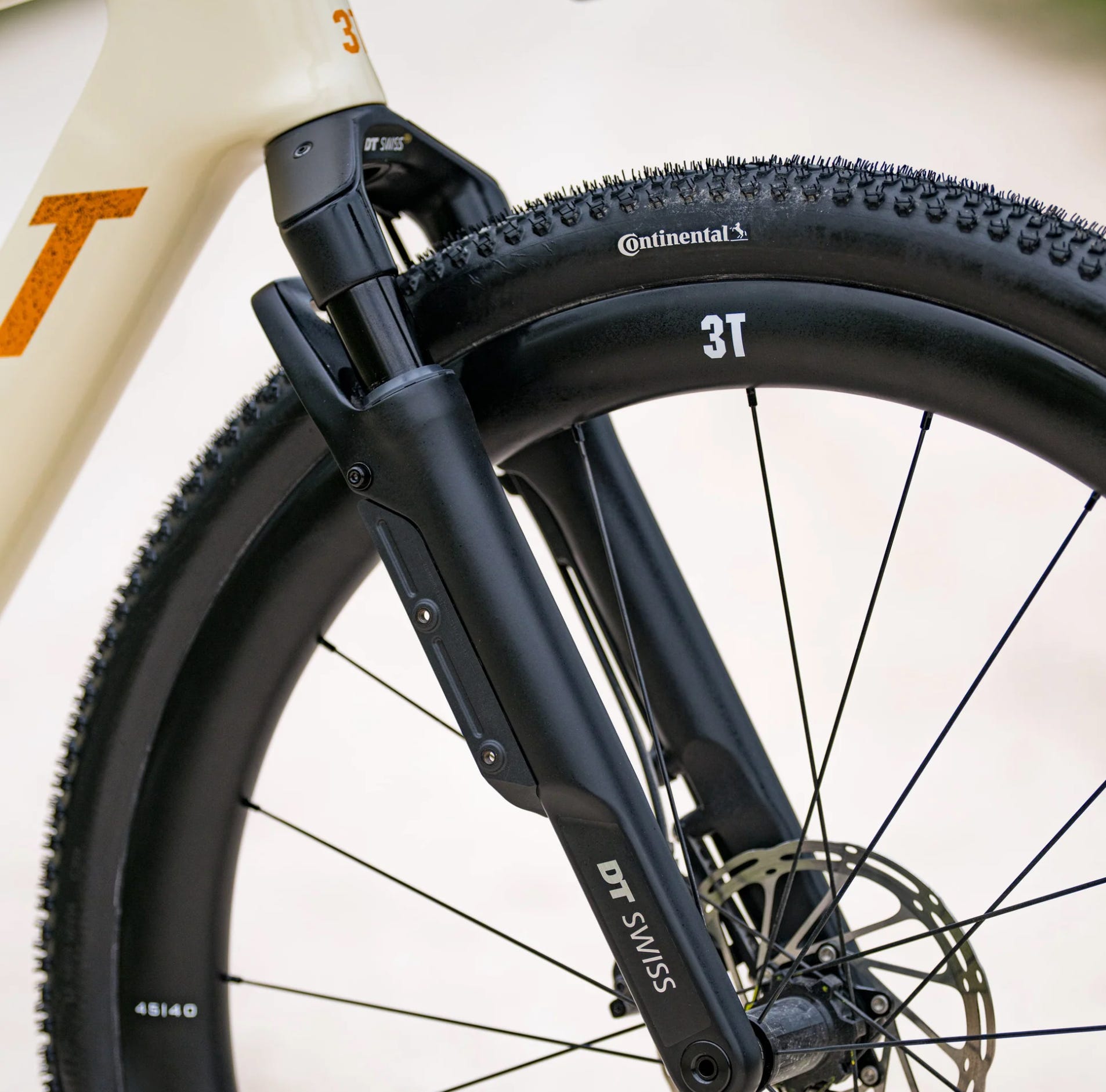L’elemento tecnico che più caratterizza la Ultra² Italia rispetto al resto della gamma gravel di 3T è la predisposizione nativa per la forcella ammortizzata. Non si tratta di una compatibilità accessoria, ma di una scelta progettuale integrata nel DNA del telaio. La bicicletta è stata concepita sin dall’inizio per funzionare in maniera ottimale sia con forcella rigida che con la DT Swiss F 132 ONE, una forcella specifica per il gravel con 40 mm di escursione e blocco remoto al manubrio.