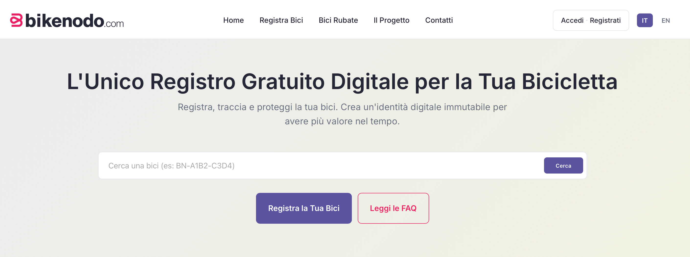 Siamo abituati a piattaforme che chiedono mille dati. Bikenodo va controcorrente: puoi registrare la tua bici senza inserire dati personali (nome, mail, telefono). Contano i dati del mezzo, non i tuoi.