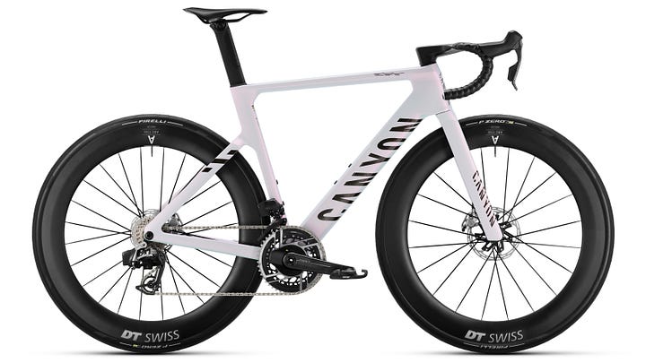 Sono previste due versioni: una con gruppo Shimano Dura-Ace Di2, trasmissione 52-36 e cassetta 11-30, con misuratore di potenza Shimano integrato; l’altra con SRAM Red AXS, trasmissione 50-37 e cassetta 10-33, con misuratore di potenza SRAM (non disponibile negli USA). Entrambe le versioni pesano 7,5 kg e montano ruote DT Swiss ARC 1100 da 65 mm, reggisella VCLS Aero e sella Selle Italia SLR. Per i clienti europei, mediorientali e africani è disponibile il programma MyCanyon per la personalizzazione della bici.