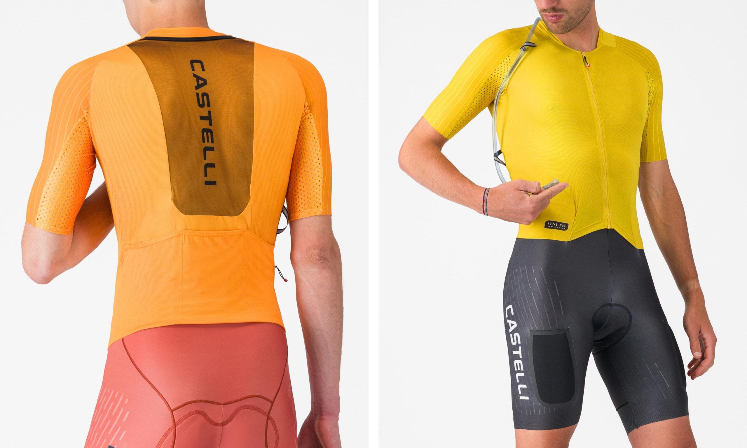 Il corpo principale del body è realizzato in tessuto Air_O Stretch, studiato per offrire massima traspirabilità e protezione dai raggi UV, con una struttura delle cuciture sulle spalle ottimizzata tramite software CFD per ridurre la resistenza all’avanzamento. Nella parte inferiore, Castelli ha preso il meglio della sua tecnologia da strada, utilizzando il tessuto Forza2 Stretch dei pantaloncini Free Aero Race S, dichiarando una riduzione del coefficiente di resistenza aerodinamica pari al 3%.