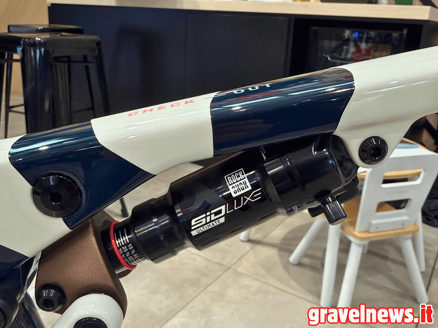 È una gravel full-suspension con telaio in carbonio e 55 mm di escursione posteriore, ottenuti grazie al compatto ammortizzatore RockShox SIDluxe IsoStrut, abbinato alla nuova forcella RockShox Rudy XL da 60 mm.