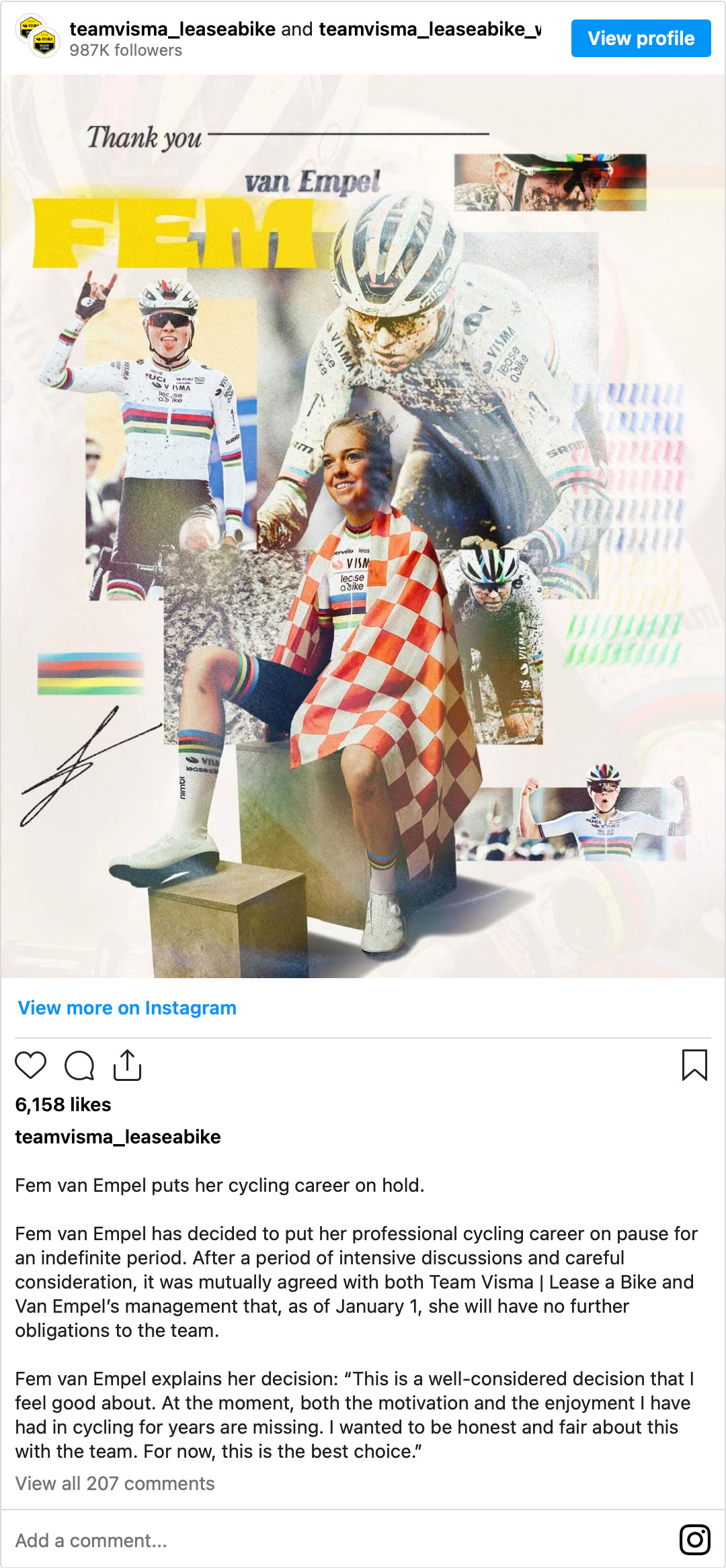 Il team Visma | Lease a Bike ha espresso pieno rispetto per la scelta della propria atleta. Il CEO Richard Plugge ha sottolineato quanto Van Empel abbia rappresentato per la squadra e per il ciclocross in generale, ricordando i successi storici ottenuti insieme e augurandole il meglio per il futuro, sportivo e personale.