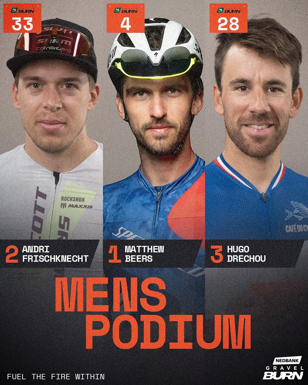 Beers, cresciuto proprio nella Garden Route, non ha deluso le aspettative del pubblico di casa, imponendo un ritmo costante e autoritario. Dopo un avvio combattuto insieme ai connazionali Tristan Nortje e Marco Joubert (IMBUKO ChemChamp), il due volte campione nazionale gravel ha aperto il gas sull’ultima salita verso il passo, seguito dallo svizzero Andri Frischknecht (Scott SRAM) e dal francese Hugo Drechou (Numéro31.cc / Pinarello).