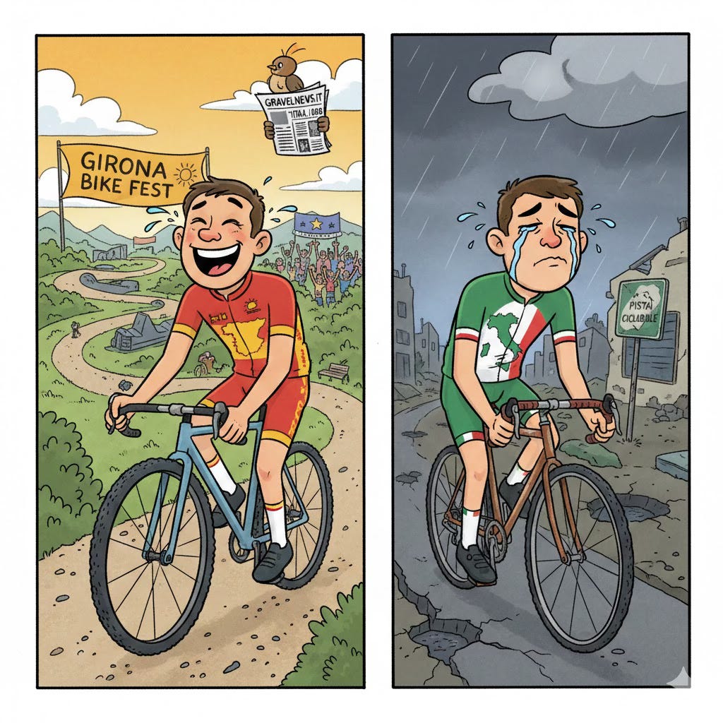 Guardiamo la Spagna. Un Paese che ha capito tutto, trasformando il territorio in una corazzata economica legata alle due ruote. Hanno creato Girona, diventata ufficialmente la Mecca mondiale del gravel: una città dove professionisti e appassionati da ogni continente si ritrovano per pedalare su strade bianche perfette, sostenuti da un’industria di servizi, caffè ciclistici e guide che da noi è pura fantascienza. Hanno saputo vendere un territorio.