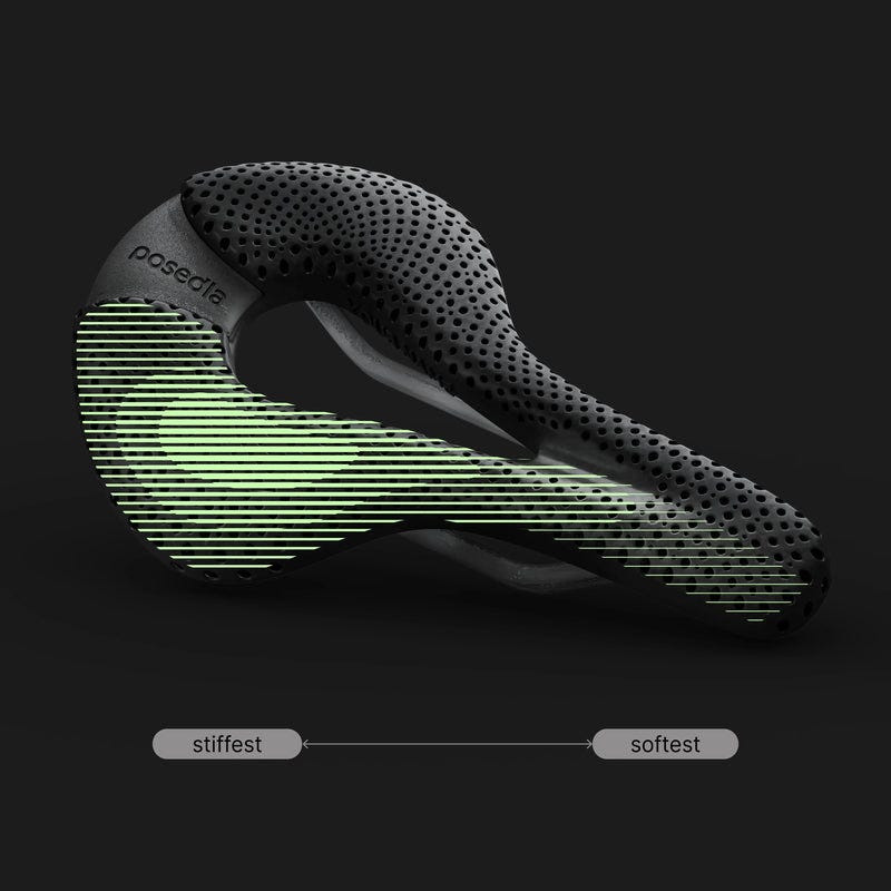 Il vero tocco di genialità sta nella personalizzazione della rigidità del padding. Grazie alla stampa 3D, Posedla adatta la densità del materiale in base ai dati forniti dal ciclista, ottenendo così una distribuzione della pressione ottimale. Il risultato? Un supporto preciso dove serve, con il comfort che non compromette le prestazioni.