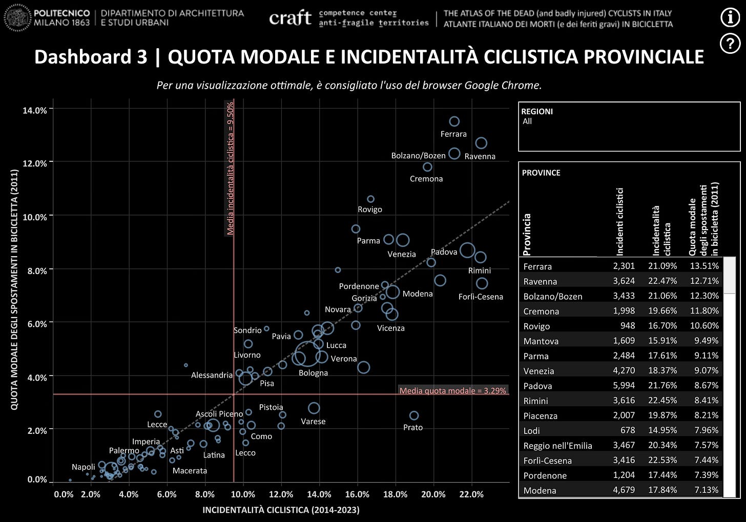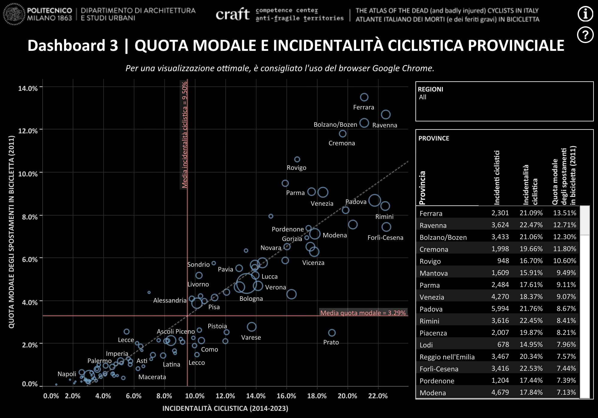Realizzato dal Competence Centre on Anti-Fragile Territories (CRAFT) e coordinato da Paolo Bozzuto del Dipartimento di Architettura e Studi Urbani (DAStU), l’Atlante italiano dei morti e feriti gravi in bicicletta rappresenta la mappatura più dettagliata mai condotta sull’incidentalità ciclistica nel nostro Paese.