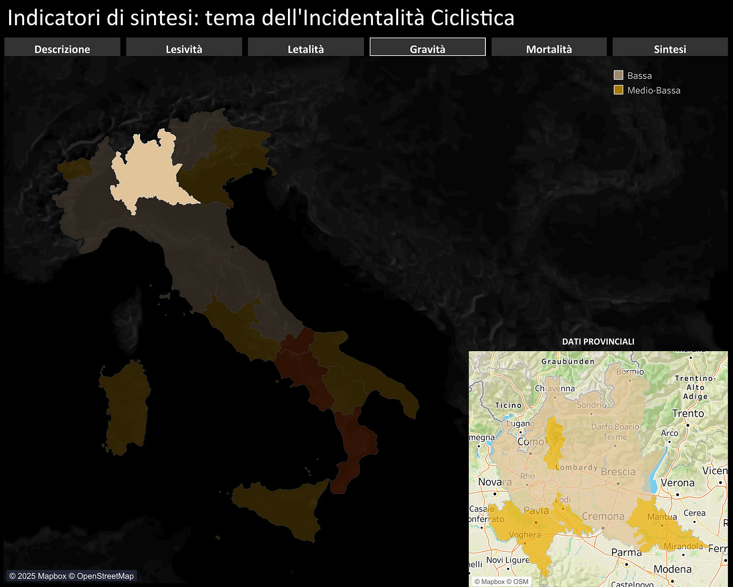 Lo strumento, basato su dati ISTAT e su un sistema di geolocalizzazione puntuale per gli anni 2022 e 2023, copre il periodo 2014–2023 e permette di esplorare il fenomeno comune per comune. Cinque dashboard online mostrano dinamiche, gravità, distribuzione territoriale, mortalità e correlazioni tra diffusione dell’uso della bici e numero di sinistri.