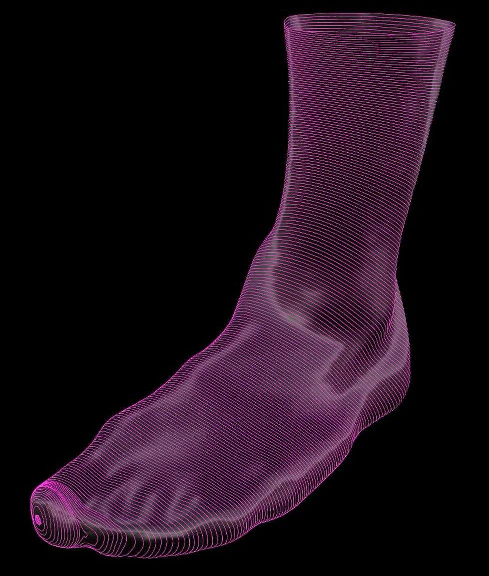 Prima si esegue la scansione del piede con lo smartphone o in un laboratorio dedicato. Questi dati diventano la base per progettare forma, struttura della suola e geometria della tomaia. La scarpa viene poi costruita tramite manifattura robotica additiva e fibre di carbonio continue per ottimizzare la trasmissione di potenza e ridurre i punti “morti” nella pedalata.