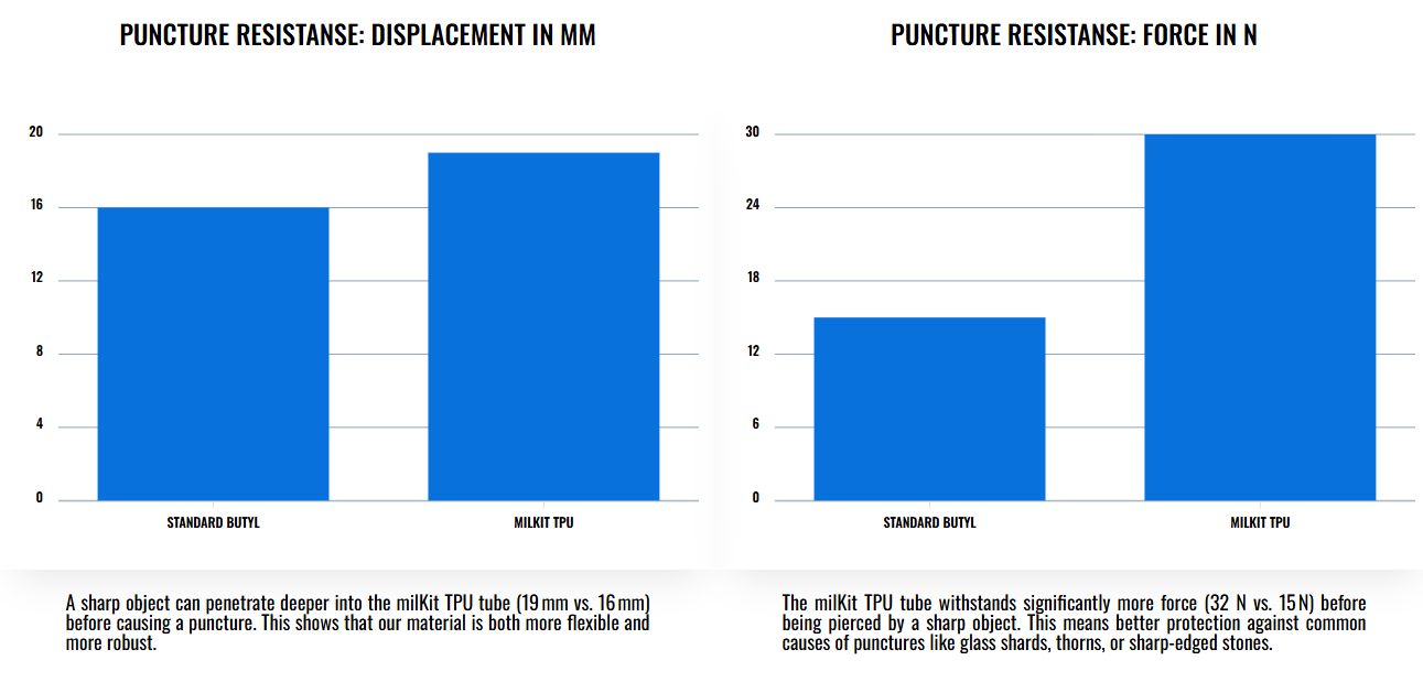 Secondo i test condotti da milKit, queste tube resistono fino a 32Nm di forza contro oggetti appuntiti come vetri rotti, spine o sassi taglienti, mentre le tube in butile cedono già a 15Nm. Anche la resistenza alle forature da pizzicamento risulta migliorata.