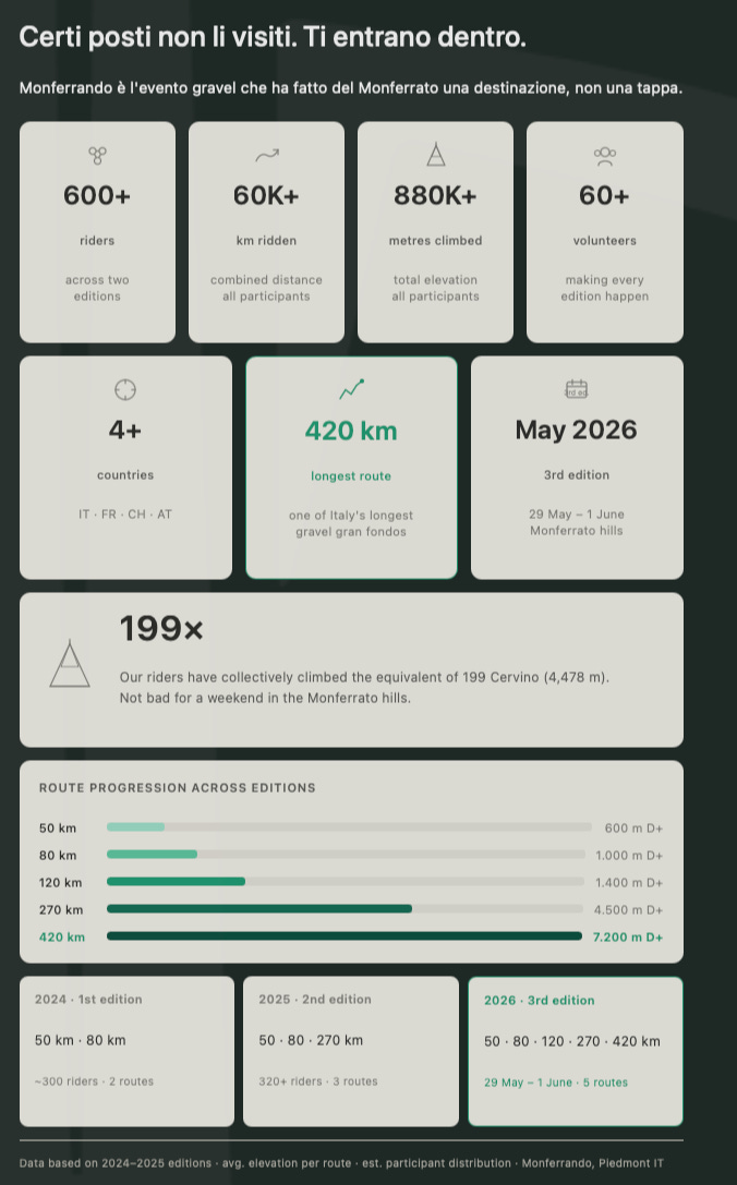 Organizzato dall’ASD SQD di Alessandria, l’evento ha alle spalle due edizioni già sold-out — un segnale che il mercato delle gravel adventure di qualità, non competitive e legate al territorio, sta crescendo in modo concreto. Per il 2026 sono attesi oltre 700 partecipanti, per un totale stimato di oltre 80.000 chilometri pedalati in forma aggregata nel corso dei sei giorni.