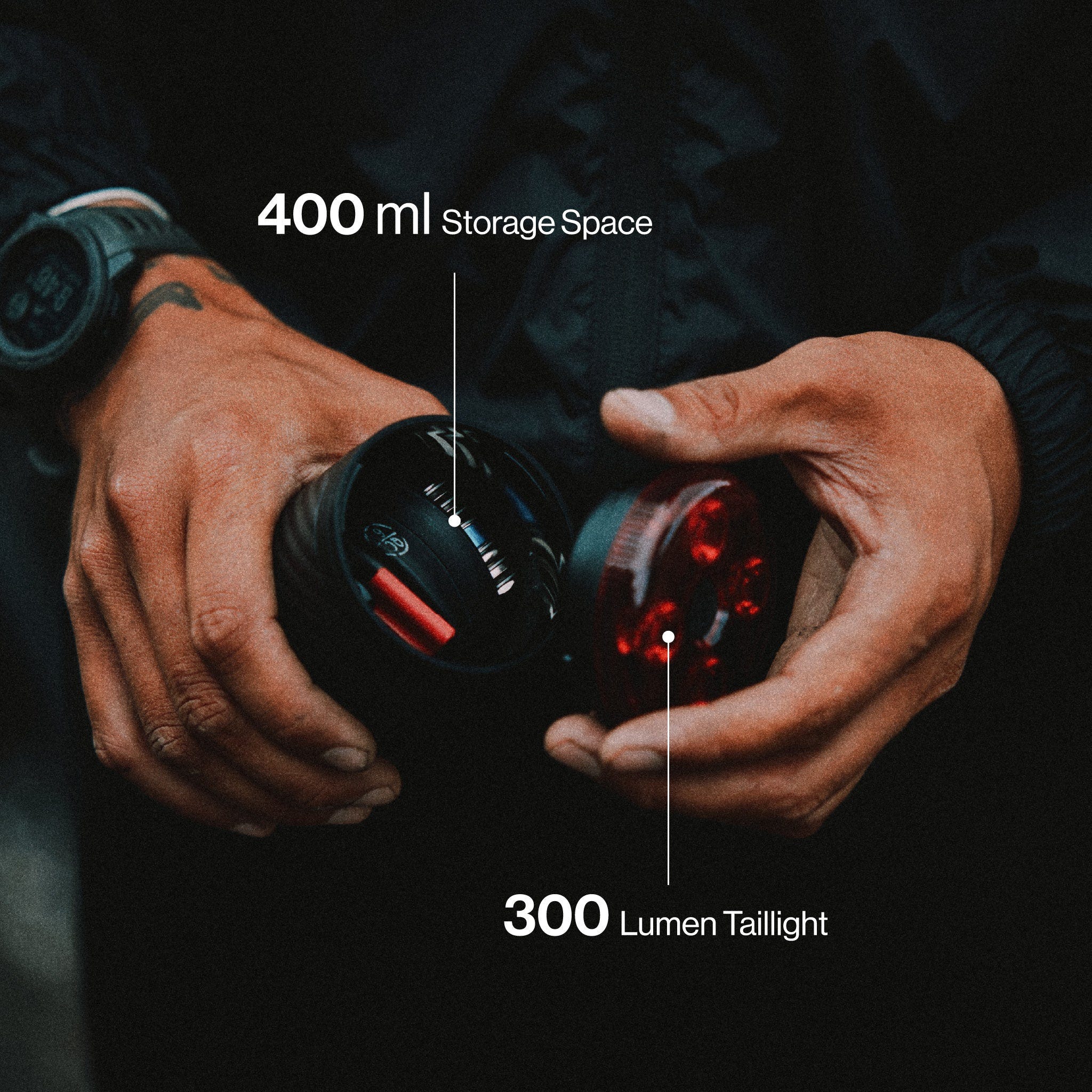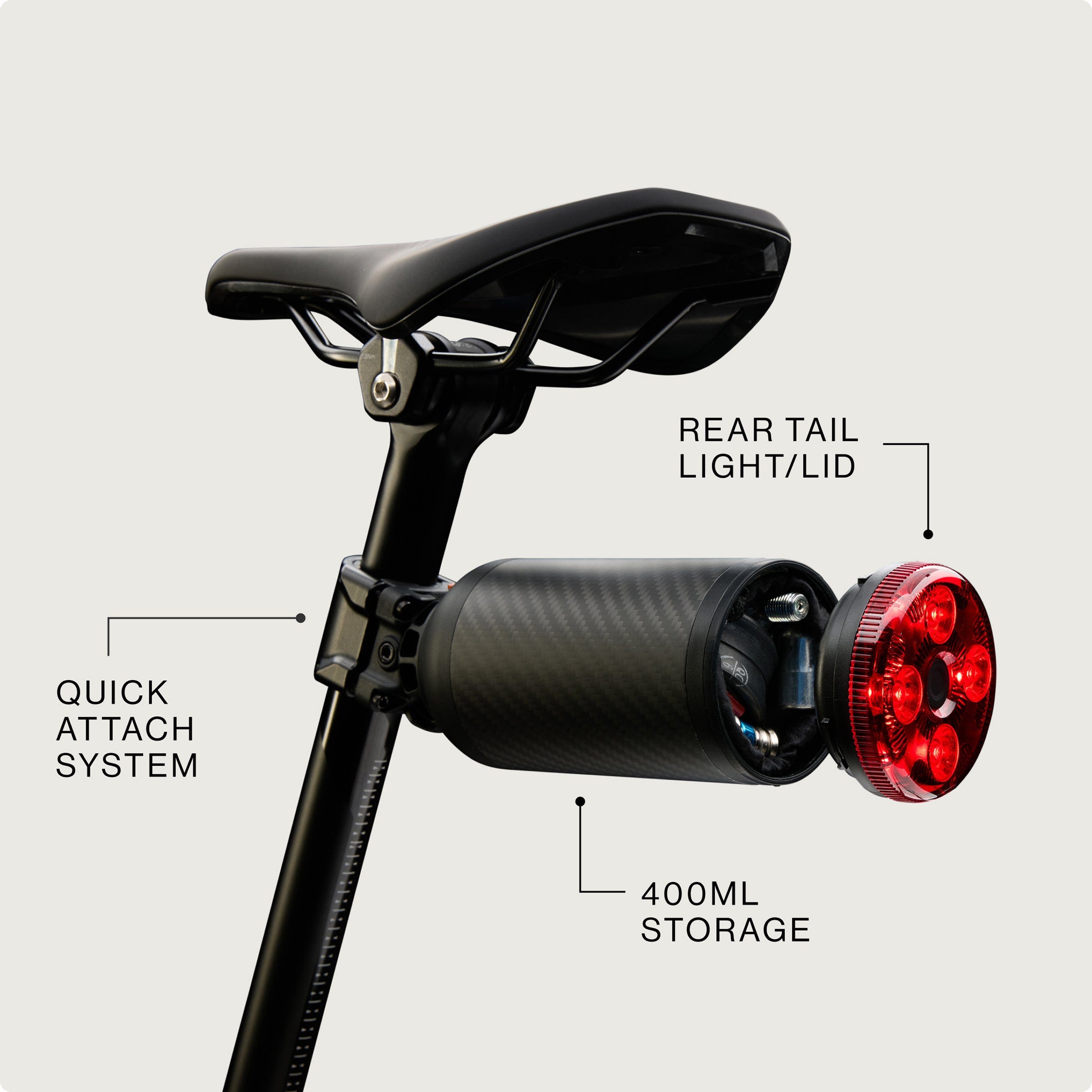 Il cuore del progetto è il Tri-Fin Mount, un attacco universale compatibile con la maggior parte dei reggisella (anche aero) e pensato per essere la base su cui costruire la propria configurazione. Al mount si agganciano rapidamente gli altri moduli: la Carbon Capsule Pro, un contenitore da 400 ml in fibra di carbonio che integra un potente fanale posteriore da 300 lumen; il PakLite Mini, luce compatta da 220 lumen con funzioni smart; e il Fender GT/XL, parafango disponibile in due misure che può ospitare sia la capsule sia la luce.