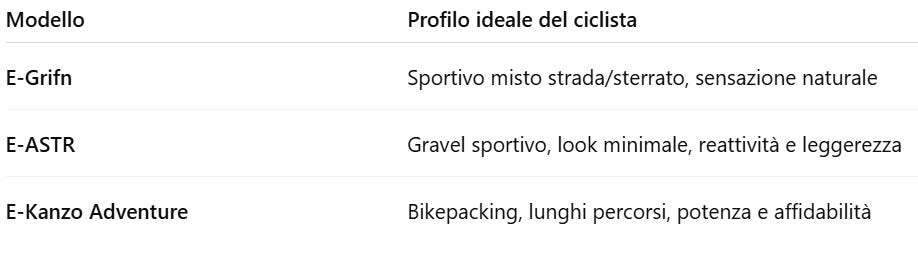 In sintesi, Ridley propone tre e-gravel bike con caratteri ben distinti, ciascuna capace di rispondere a una tipologia di rider: