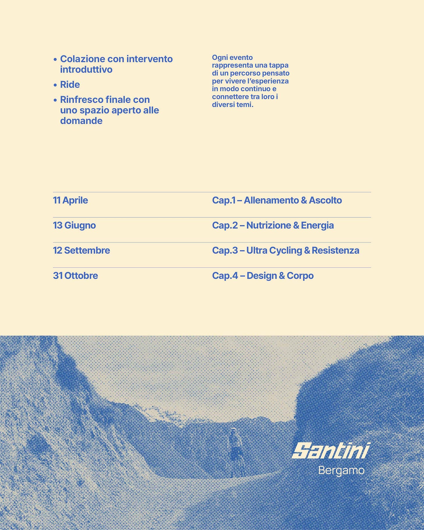 Il circuito si snoderà attraverso quattro appuntamenti tematici, tutti organizzati presso la sede Santini a Bergamo. Ogni incontro sarà guidato da un moderatore, e si svilupperà in tre momenti: una colazione con intervento introduttivo, una pedalata in gruppo e un rinfresco finale per un momento di confronto e scambio.