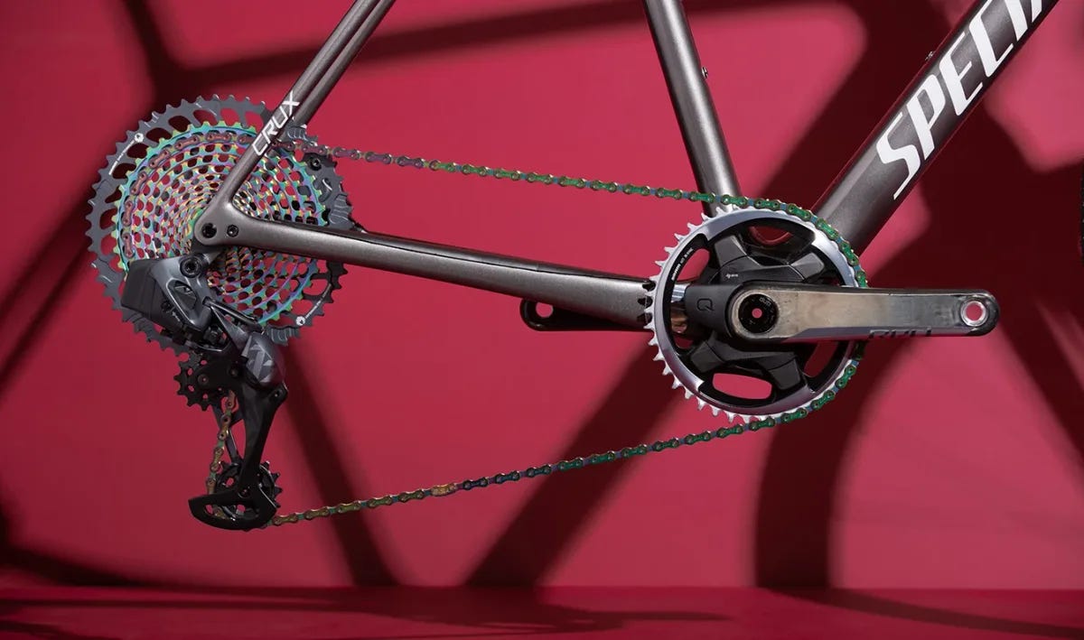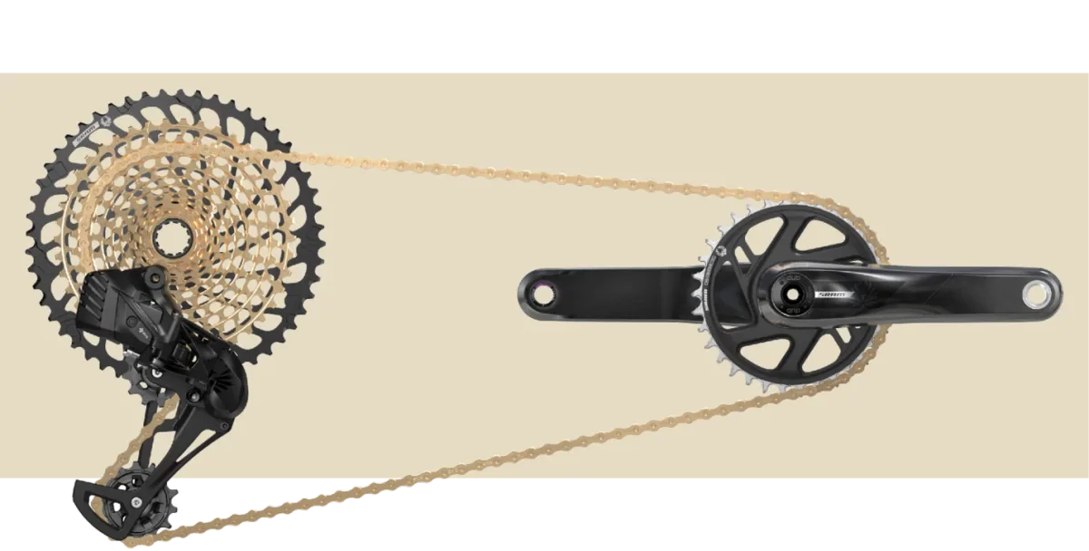 Il punto di maggiore interesse per il mondo gravel è senza dubbio il gruppo S500 AXS, che rappresenta la soluzione più economica per accedere alla tecnologia di cambio elettronico wireless SRAM. Il deragliatore è offerto a 425 euro e monta l’Overload Clutch, lo stesso sistema presente sui modelli di fascia superiore: in caso di impatto, il meccanismo disinnesta il motore-riduttore per proteggere l’unità, riportandola poi automaticamente alla posizione corretta. Non viene commercializzata una leva specifica S500, ma il deragliatore è pienamente compatibile con qualsiasi attuatore AXS già disponibile: sia i comandi drop-bar della piattaforma eTap per bici da strada e gravel, sia le leve per manubrio MTB. Questo apre scenari interessanti per chi monta una gravel bike con manubrio curvo e desidera la trasmissione wireless senza acquistare il gruppo RED XPLR AXS completo. La catena S500 è proposta a 110 euro ed è disponibile nelle varianti cromatiche Gold e Rainbow; è dichiarata compatibile con le biciclette a pedalata assistita. La cassetta XG-1299 da 52-10t è disponibile negli stessi colori al prezzo di 595 euro. La guarnitura S500 è realizzata in alluminio, adotta il sistema DUB con spaziatura Boost e include una corona X-SYNC 2 in alluminio a tre bulloni; il prezzo è di 400 euro, con lunghezze disponibili di 165, 170 e 175 mm.