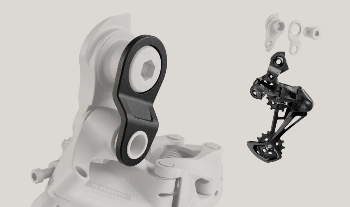 In parallelo al lancio della S-Series, SRAM ha introdotto un accessorio tanto semplice quanto efficace: il UDH Half Mount. Si tratta di una piastra di rinforzo concepita per la S100 che si fissa attorno al corpo del deragliatore sfruttando il bullone coassiale del perno ruota e il foro di montaggio UDH, aumentando la resistenza agli impatti laterali — cadute, urti contro ostacoli, slam improvvisi. Il prezzo è volutamente accessibile: 10 euro nel mercato europeo. La soluzione ricorda visivamente il vecchio HGR di Specialized degli anni Dieci, ma con un’interfaccia meccanica più sofisticata e integrata.