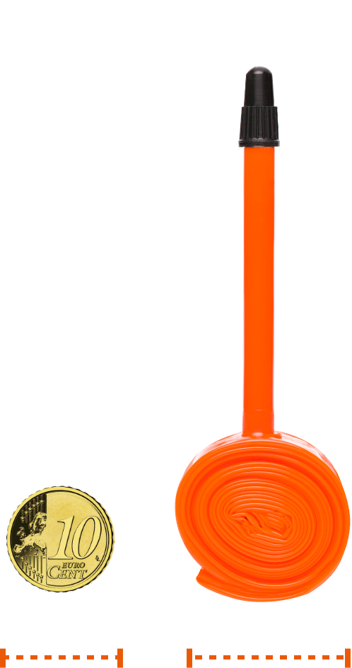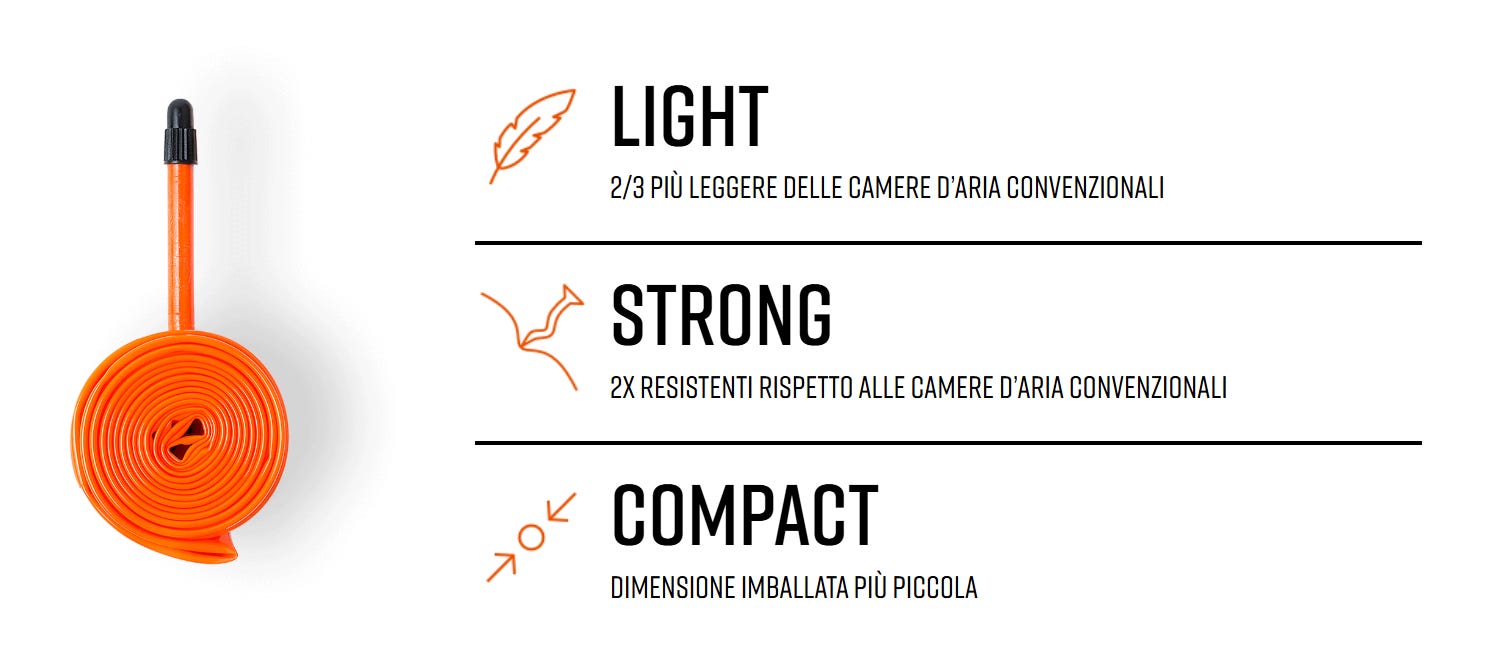 Le camere d’aria Tubolito si riconoscono subito per il vivace colore arancione, ma ciò che le distingue davvero è la combinazione di peso ridotto, compattezza e resistenza.